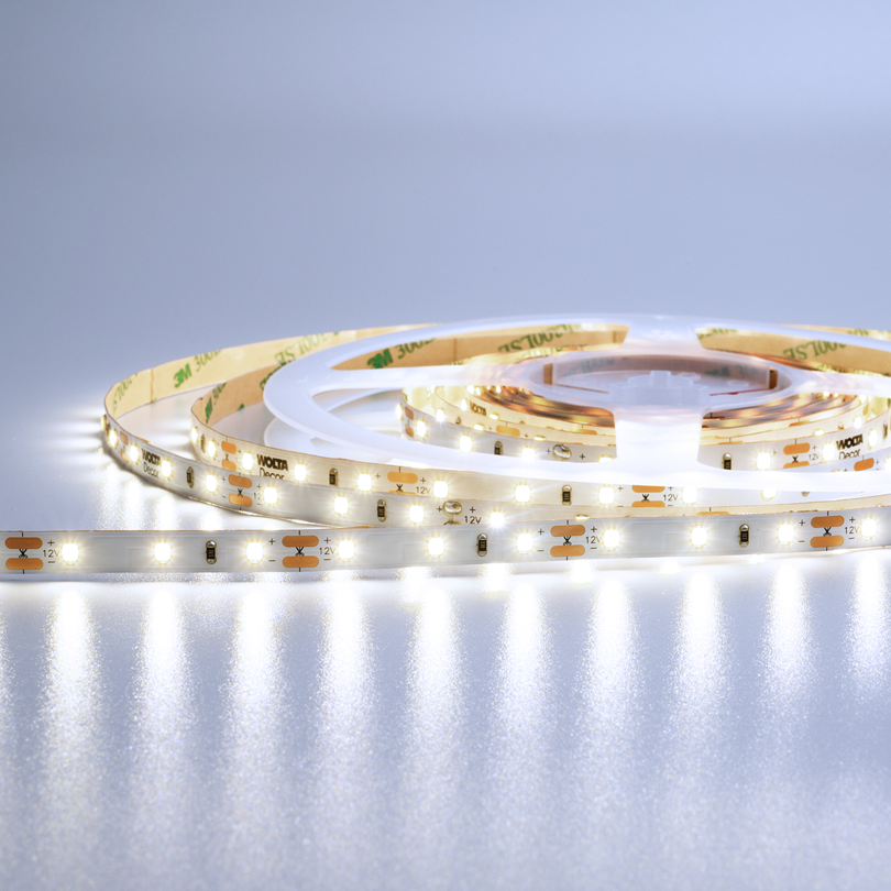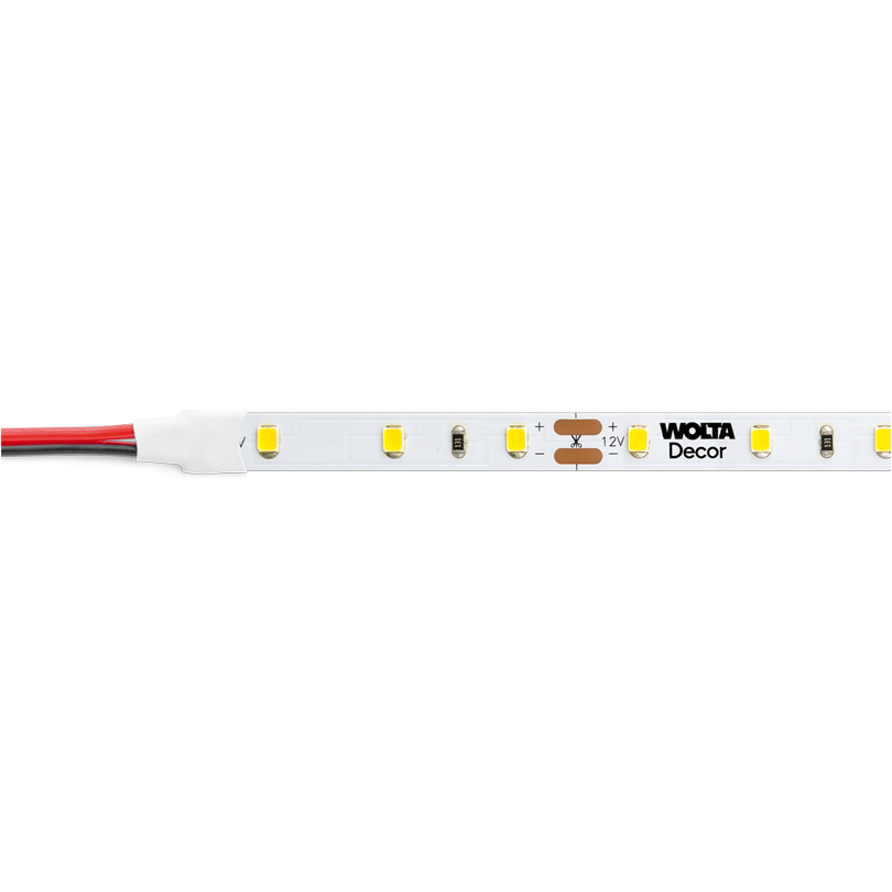 Декоративная светодиодная лента WOLTA®Decor cерии WLS представляет собой современный LED-модуль на гибкой печатной (монтажной) плате, на которой равноудалённо друг от друга расположены мощные светодиоды. Ширина ленты составляет 8-10 миллиметров (в зависимости от модели), а ее толщина со светодиодами 1-2 миллиметра. При изготовлении лента сматывается в катушку длиной 5 метров. Для ограничения подачи тока через наши светодиоды в электрическую схему WLS введены балластные сопротивления (резисторы), которые размещены на самой ленте.